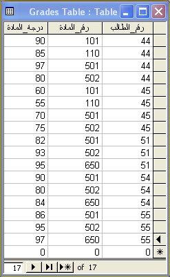 انشاء قاعدة بيانات في الأكسس Access و ربط الجداول عن طريق انشاء علاقات في هذا الدرس سنبدأ بإنشاء قاعدة البيانات التي ستستند إليها في الدروس القادمة و ربط الجداول عن طريق إنشاء علاقات Relations فيما بينها مع شرح مفصل عن أنواع العلاقات. ستكون قاعدة البيانات بسيطة بإذن الله وستحتوي على جميع الجداول والحقول التي نحتاجها لتطبيق هذه الدروس فلنبدأ على بركة الله. ابدأ --> البرامج --> Microsoft Access Start --> Programs --> MicrosoftAccess الآن اختر ملف File ثم جديد New ثم قاعدة بيانات فارغة Blank Database وقم بتسمية قاعدة البيانات الجديدة بالاسم الذي تريده وليكن my database. الخطوة الأولى: تشتمل قاعدة البيانات على ثلاث جداول:الأول:لإدخال بيانات الطلاب وسنسميه بالاسم Student Table ، ويشتمل على الحقول الموضحة بالصورة: مع ملاحظة أن حقل "الرقم" يتم تعيينه كمفتاح أساسي Primary Key للجدول وذلك بالوقوف عند هذا الحقل ثم الضغط على أيقونة Primary Key من شريط الأدوات القياسي أو عن طريق اختياره من قائمة تحرير Edit . الثاني:لإدخال بيانات المواد التي يدرسها الطلاب وسنسميه بالاسم Course Table ، ويشتمل على الحقول الموضحة بالصورة: مع ملاحظة أن حقل "رقم_المادة" يتم تعيينه كمفتاح أساسي Primary Key للجدول وذلك بالوقوف عند هذا الحقل ثم الضغط على أيقونة Primary Key من شريط الأدوات القياسي أو عن طريق اختياره من قائمة تحرير Edit . الثالث: لإدخال الدرجات التي حصل عليها الطلاب في هذه المواد وسنعطيه الاسم Grades Table ، ويشتمل على الحقول الموضحة بالصورة: ملاحظة: عند حفظ هذا الجدول ستظهر لك الرسالة التالية: والتي مفادها باختصار أن هذا الجدول لم يتم تعيين مفتاح أساسي له بالرغم من أنه يستحسن ذلك، فهل ترغب بوضع مفتاح أساسي له؟ سنختار No حيث لا نحتاج لمفتاح أساسي وحيد لهذا الجدول، وسيتم ربط هذا الجدول بالجدولين السابقين عن طريق الحقلين: رقم_الطالب رقم_المادة وبذلك فإننا نعتبر المفتاح الأساسي لهذا الحقل مفتاح مركب من كلا الحقلين السابقين. وبذلك نكون قد انتهينا من أول خطوة في هذا الدرس ألا وهي إنشاء قاعدة البيانات والجداول. الخطوة الثانية: إدخال البيانات في الجداول: قم بفتح كل جدول من الجداول السابقة في وضع Datasheet View، وقم بإدخال ما يحلو لك من بيانات بالشكل الذي يلائم نوع بيانات الحقل نفسه. افترض أننا قمنا بإدخال البيانات الآتية: StudentTable CourseTable GradesTable ملاحظات هامة: * إذا كان آكسس يعرض لك الحقول في الجدول من اليسار لليمين، وكنت تريد كتابة سجلات الجدول باللغة العربية فلك أن تغير طريقة عرض بيانات الجدول لتصبح من اليمين لليسار كالآتي: افتح الجدول في عرض التصميم Design View ثم انقر على شريط الجدول بالزر الأيمن واختر خصائص Properties ثم قم بتغيير الخاصية Orientation إلى Right-to-left كما بالصورة: * قمت بتسمية الحقول هكذا: الاسم_الأول، الاسم_الأخير، محل_الميلاد، ........ الخ ، أي بدون فصل الكلمتين عن بعضهما وذلك لتسهيل عملية كتابة الأكواد والشروط فيما بعد. يمكنك تغيير طريقة ظهور اسم الحقل في عرض ورقة البيانات حتى لا تظهر فقط بهذا الشكل مع بقاء التسمية الحقيقة كما هي كالآتي: - افتح الجدول في عرض التصميم Design View - قف بالمؤشر عند الحقل الذي تريد تغيير تسميته - من خصائص الحقل بالأسفل قم بتغيير الخاصية Caption إلى الاسم الذي تريده، كما هو واضح من المثال بالصورة: -قم بحفظ التغيرات في الجدول ثم افتح الجدول في وضع عرض ورقة البيانات Datasheet View وستلاحظ بنفسك التغير الحاصل في تسمية الحقول. خلاصة الدرس:هذا الدرس يعتبر مراجعة لما سبق ويفترض الآن أنك أصبحت ماهرا في إنشاء الجداول والتحكم بخصائص الحقول وإظهارها بالشكل المناسب. قمنا بعمل قاعدة بيانات تحتوي على ثلاثة جداول: الأول: يعرض بيانات الطالب ويعتبر رقم الطالب هو المفتاح الأساسي Primary Key لهذا الجدول. الثاني: يعرض بيانات المواد التي يدرسها الطلاب ويعتبر رقم المقرر هو المفتاح الأساسي Primary Key لهذا الجدول. الثالث: يعرض الدرجات التي حصل عليها الطلاب في المقررات التي يدرسونها ويحتوي هذا الجدول على مفتاحان